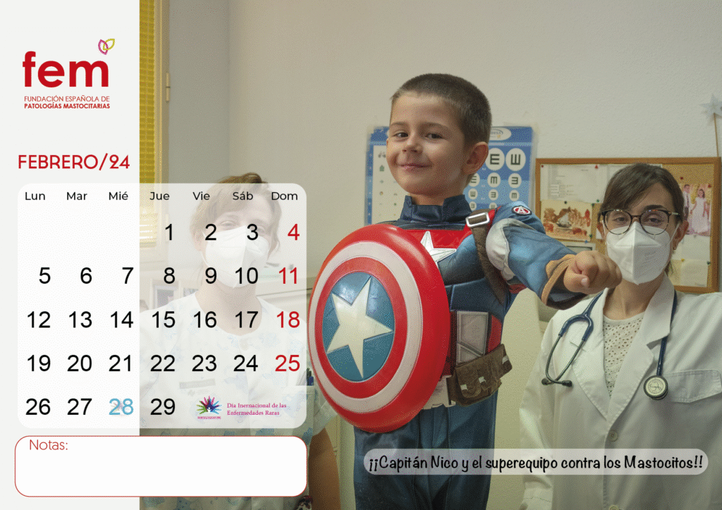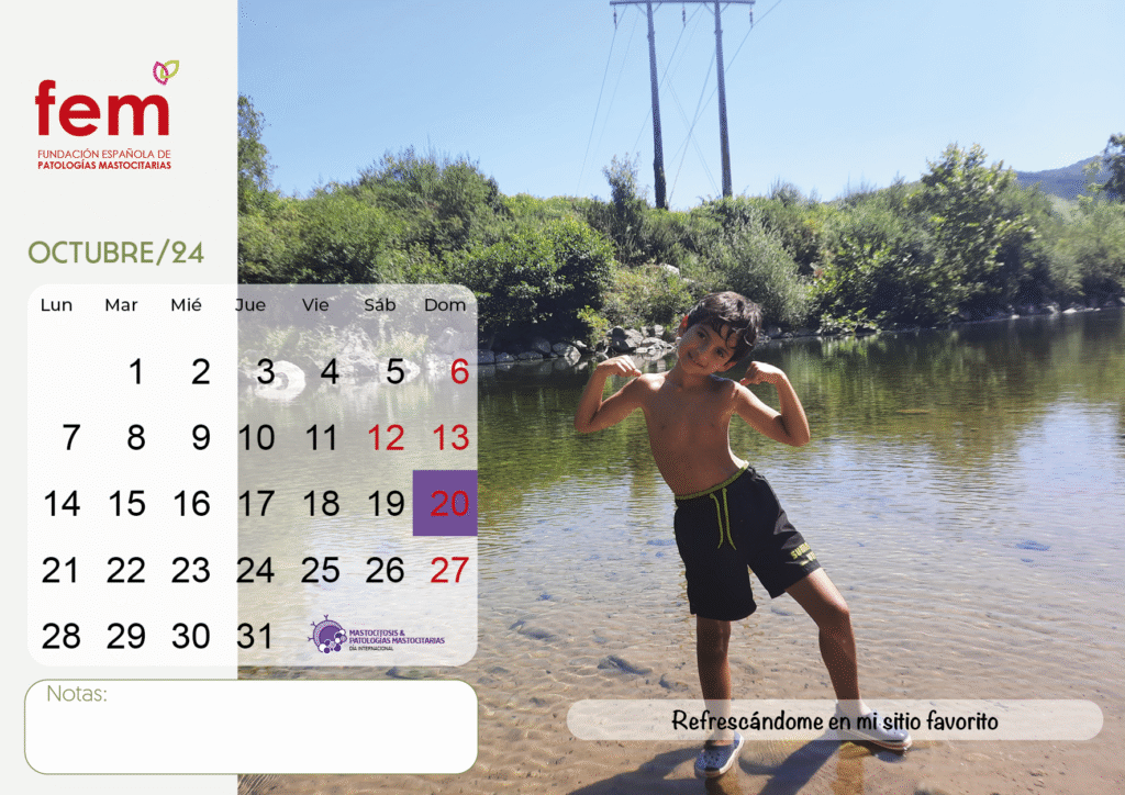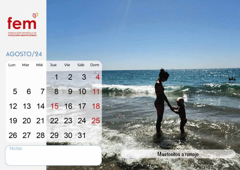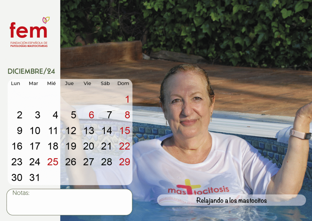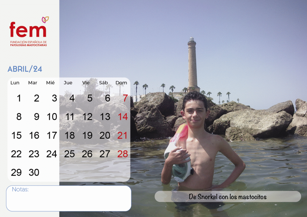 Como todos los años desde la AEDM colaboramos en la elaboración del calendario de la FEM. Esta colaboración consiste en la cesión de una serie de fotos de afectados de patología mastocitaria, con una frase de su elección.