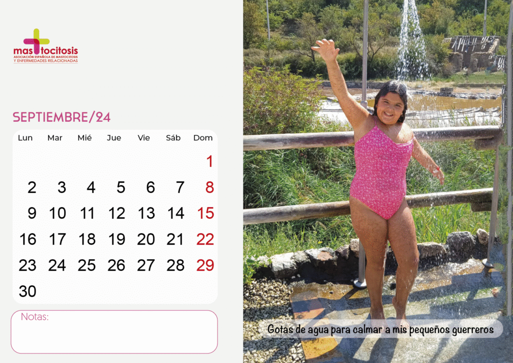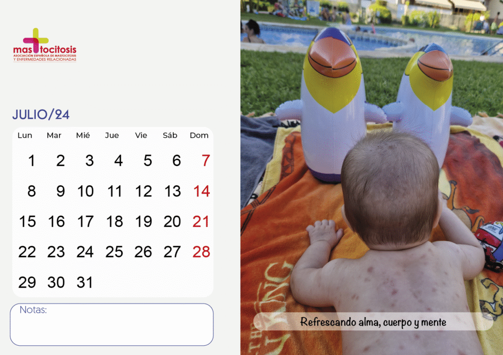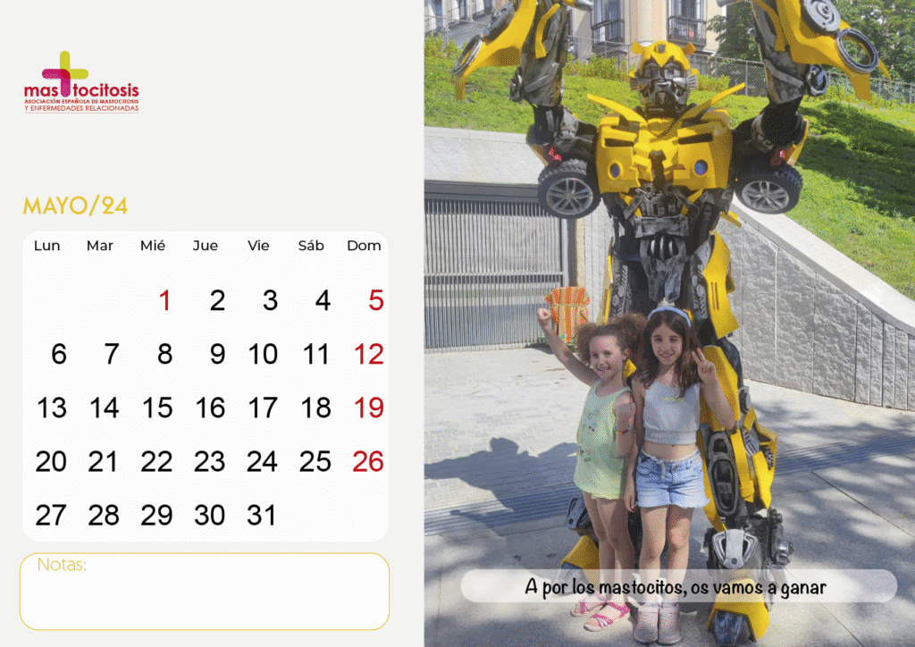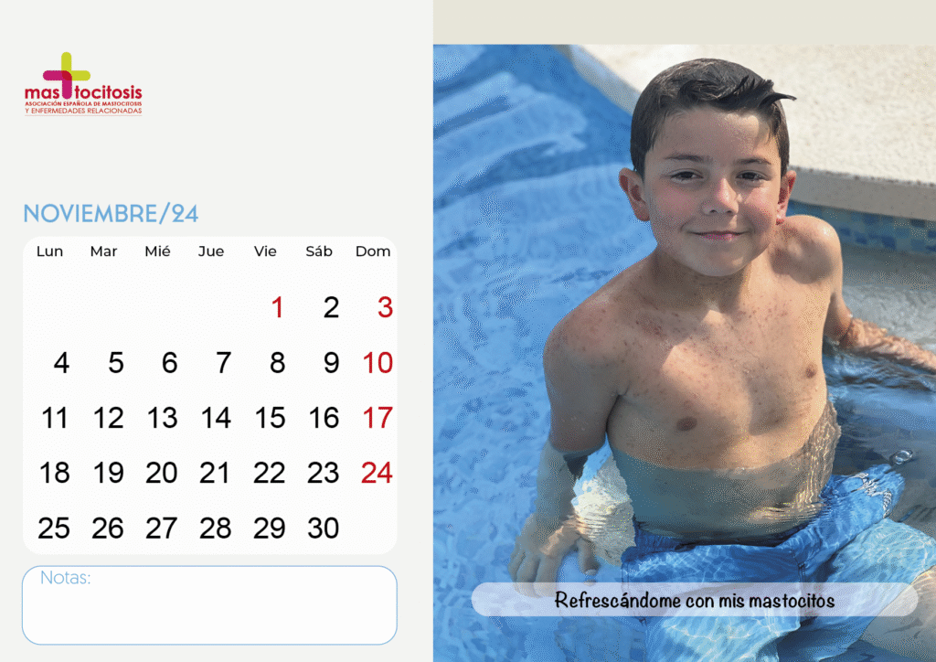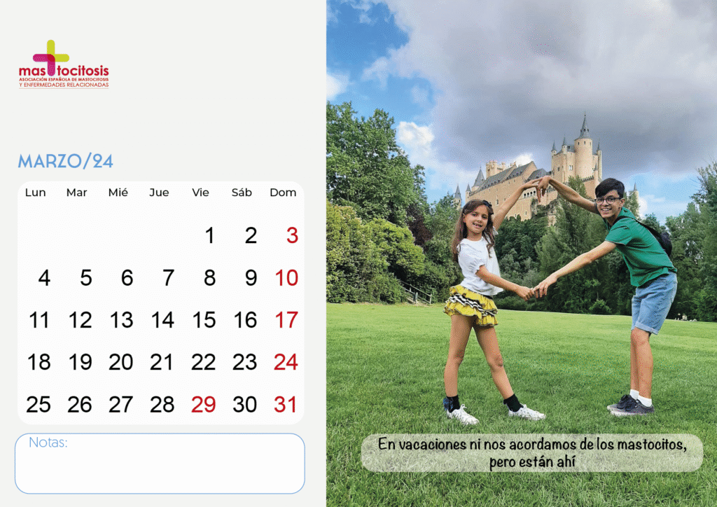 Como todos los años desde la AEDM colaboramos en la elaboración del calendario de la FEM. Esta colaboración consiste en la cesión de una serie de fotos de afectados de patología mastocitaria, con una frase de su elección.